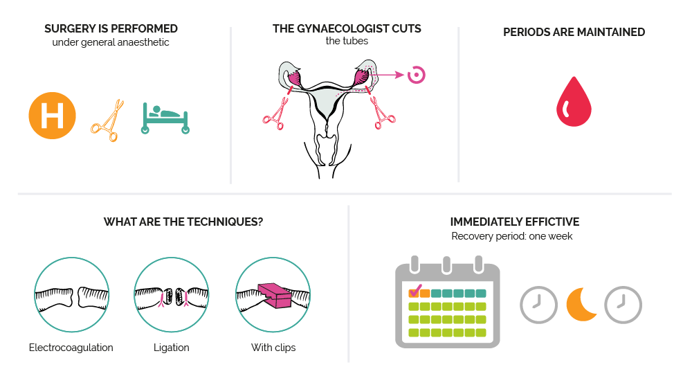 Concretely, this surgery is performed in a hospital setting by a gynecologist, under general anesthesia and lasts around 30 minutes. During the appointment, a small laparoscopic incision (surgical technic), made at the navel allows access to the tubes. Chirurgical instruments are used by the gynecologist/surgeon to proceed to the medical act. Hospitalization lasts around 24 to 48 hours. In the days following the surgery, the operated area is sensitive, and pain may be felt in the abdomen. Contraceptive effect is immediate, nevertheless it is advised not to have sexual intercourse during the week following the surgery. The recovery period lasts around one week.